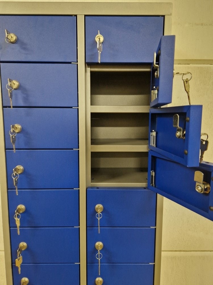 Stalen mini-locker voor het veilig opbergen van kostbaarheden als portemonnee, sleutels en mobiele telefoon.